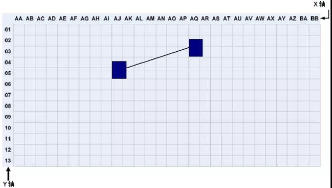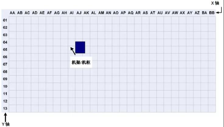在數(shù)據(jù)中心,機柜和機架的位置和布局可以根據(jù)活動地板的劃分進(jìn)行組織和標(biāo)記。根據(jù)ANSI/TIA/EIA-606-A標(biāo)準(zhǔn),數(shù)據(jù)室應(yīng)使用兩個或兩個字母,每個600mm*600mm活動地板用阿拉伯?dāng)?shù)字標(biāo)識。在數(shù)據(jù)中心機房平面圖上建立X、Y坐標(biāo)系的網(wǎng)格,用字母標(biāo)記X軸,用數(shù)字標(biāo)記Y軸,建立坐標(biāo)原點。機架和機柜的位置基于它們在網(wǎng)格地圖上的正面坐標(biāo)。標(biāo)注如下圖 2所示