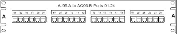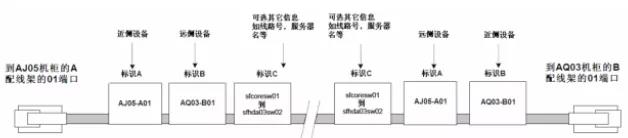 例如,連接到圖4.7.4-3所示配線架第一個位置的線纜可能包含如下標(biāo)簽:AJ05-A01/AQ03-B01。 AQ03 機柜中的同一根電纜將包含以下標(biāo)簽:AQ03-B01/AJ05-A01。如圖6 如圖。